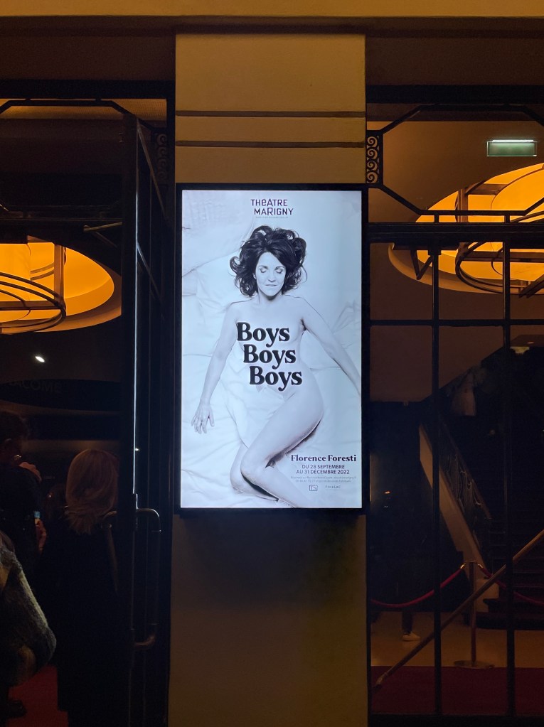 Je pense qu’on ne présente plus Madame Foresti ! Je l’avais déjà vue sur scène lors de ses 3 précédents spectacles et j’ai eu l’occasion d’aller voir sa toute dernière création : Boys, Boys, Boys qui se joue au Théâtre Marigny (malheureusement je crois que c’est sold out). On rit dès la première minute et c’est un vrai travail des abdos pendant 1h15. Des histoires de la vie de tous les jours, des imitations, des personnages inventés… Bref, difficile de décrire un show qui s’écoute, se regarde et se vit, mais j’ai encore une fois adoré son travail d’humoriste (car très déçue de sa série Désordre sur Canal+).