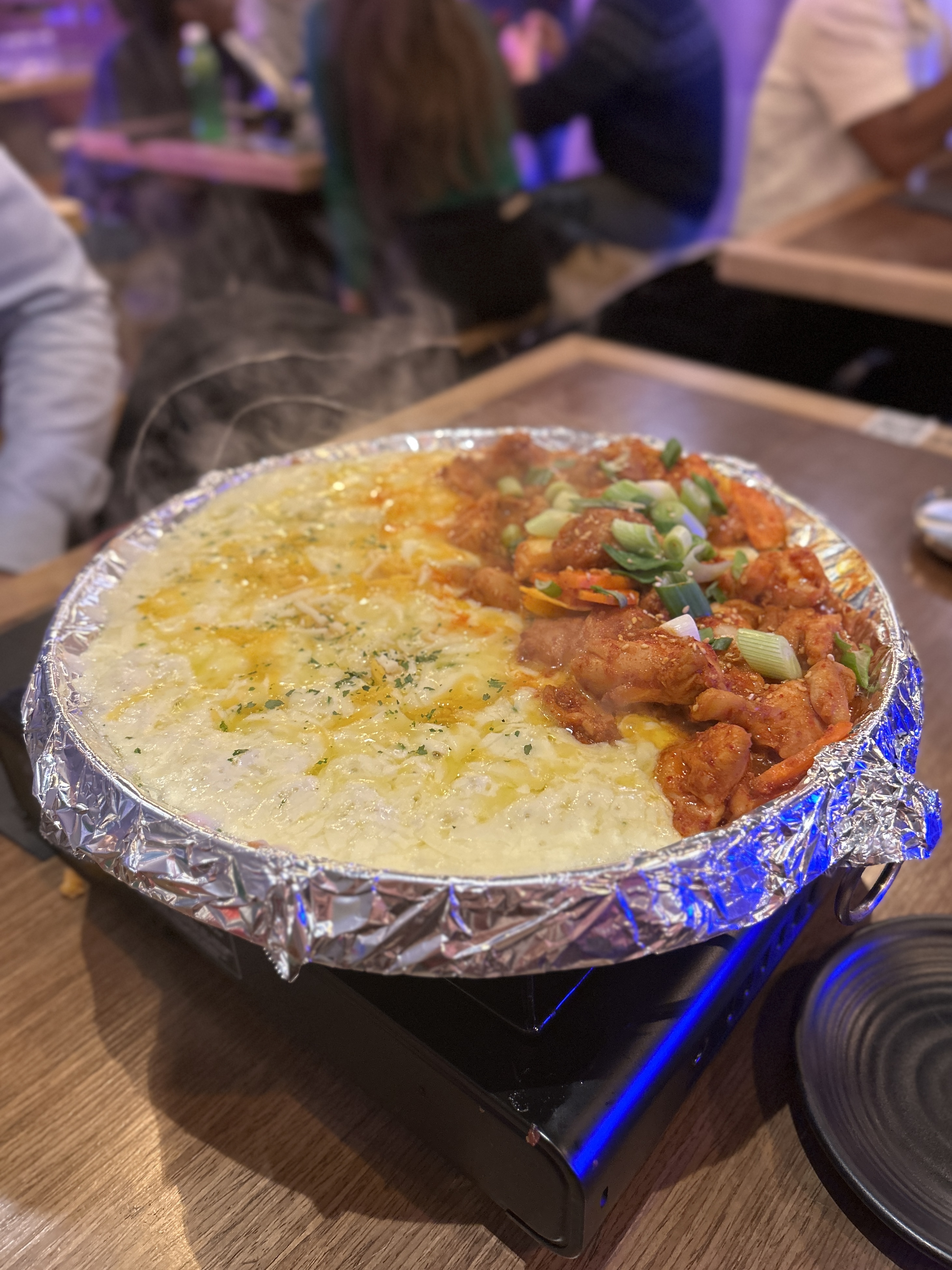 Cette adresse a ouvert il y a tout juste un mois, rue Saint Lazare. Jjan! est un immense restaurant sur 2 étages, où l’on sert plutôt des mets issus de la street-food coréenne comme le korean fried chicken, des pancakes au kimchi, des tteokbokki du corn cheese. En un diner je n’ai évidemment pas pu tout goûter mais j’ai beaucoup aimé les très copieux kimchi-bokkeumbap bomb (arancini de riz sauté au kimchi et fromage) et surtout le plat que tout le monde prend à partager, le cheese dakgalbi. Dans un poêlon qui chauffe devant vous, une moitié de fromage rapé et l’autre de poulet sauté spicy, pour former une sorte de fondue hypeeeer réconfortante. Très gras, mais très très bon, et les prix sont corrects.