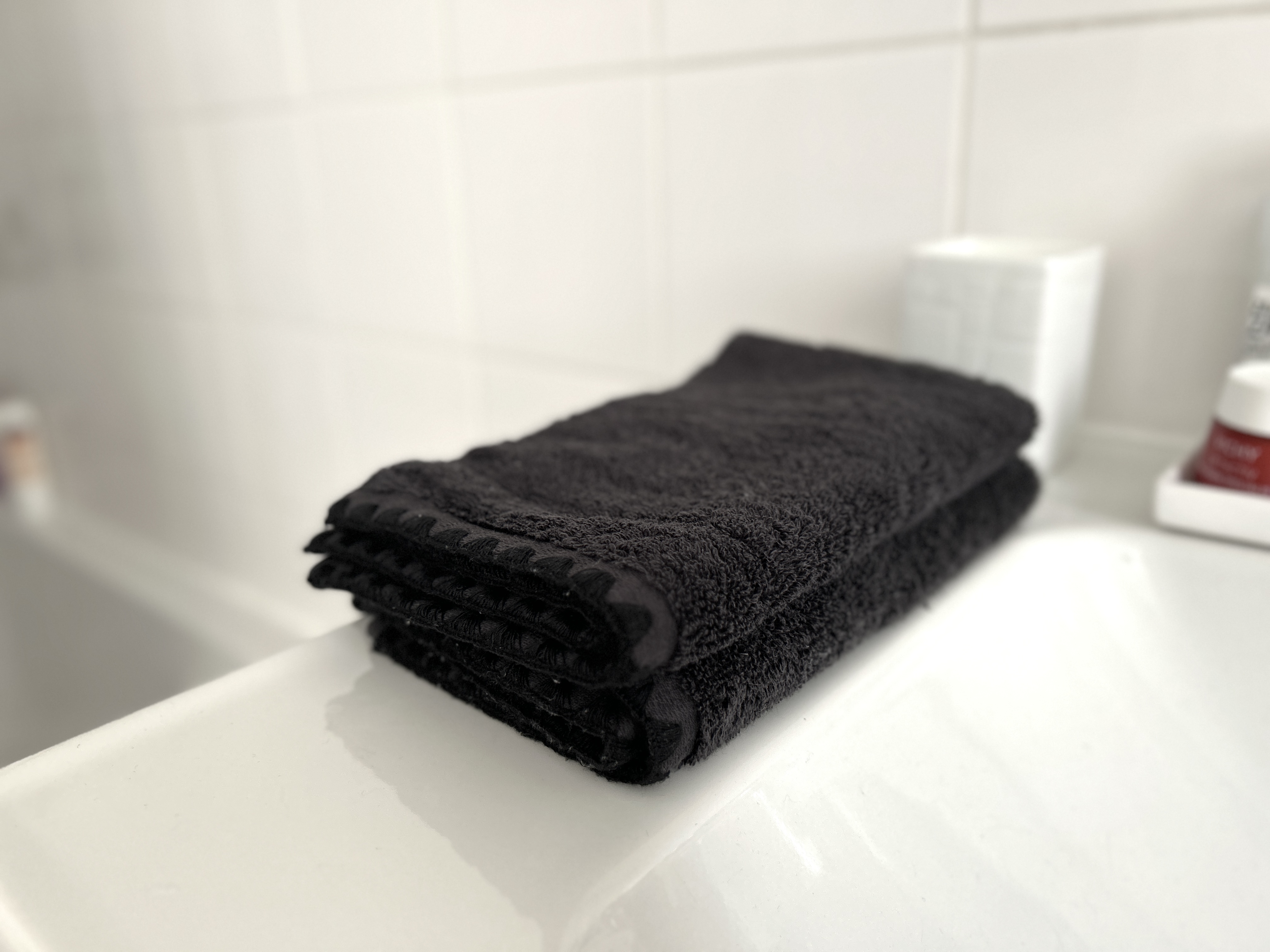 Je cherchais à remplacer mes serviettes pour les mains dans ma salle de bain et je voulais absolument qu’elles soient foncées (car on voit moins les tâches, notamment dues au fond de teint si j’ai mal lavé mes mains après m’être maquillée) et qu’elles aient une petite accroche pour pouvoir les suspendre à côté du lavabo. C’est au Grand Comptoir d’Issy que j’ai trouvé ce très joli modèle de la marque Hoamy (il existe divers coloris). Elles sont vraiment très douces et moelleuses, mais c’est surtout ce joli liseré en triangles brodés qui m’a convaincue de les acheter.
