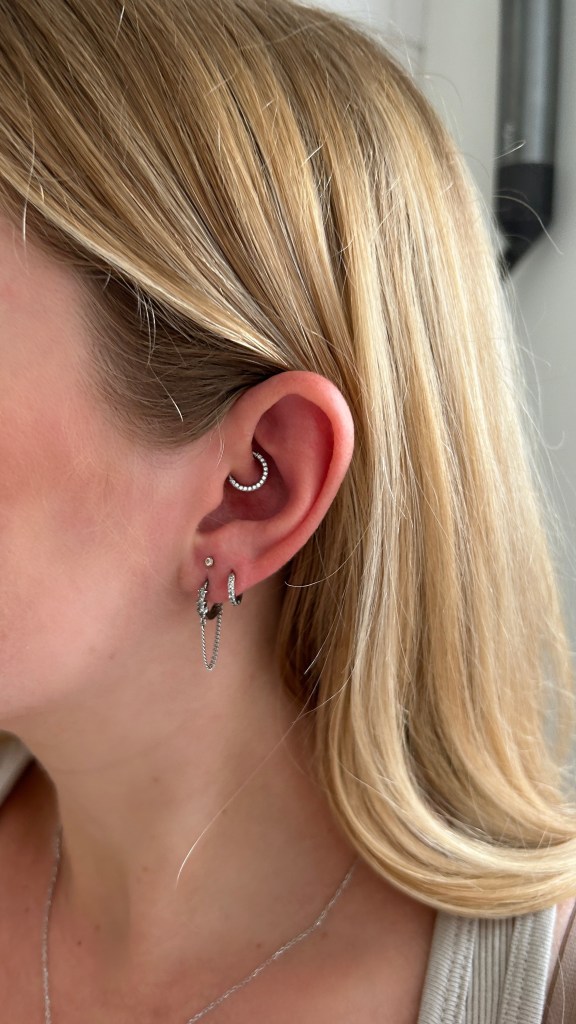 En décembre dernier je m’étais rendue au pop-up Maison Dorée dans le Marais pour faire un nouveau piercing, le Daith (et je ne vous conseillerai jamais assez de les faire chez elle car vous n’allez rien sentir et les prothèses sont très jolies, dorées ou argentées). Après 7 mois de cicatrisation, j’ai eu envie de mettre le bijou de piercing que j’avais acheté ce même jour et je l’ai fait chez un perceur près de chez moi que je connais. J’avais peur que ça soit trop tôt mais je cicatrise très bien donc le changement a été rapide et indolore. Je suis vraiment ravie d’arborer ce nouvel anneau, plus travaillé que celui de la prothèse.