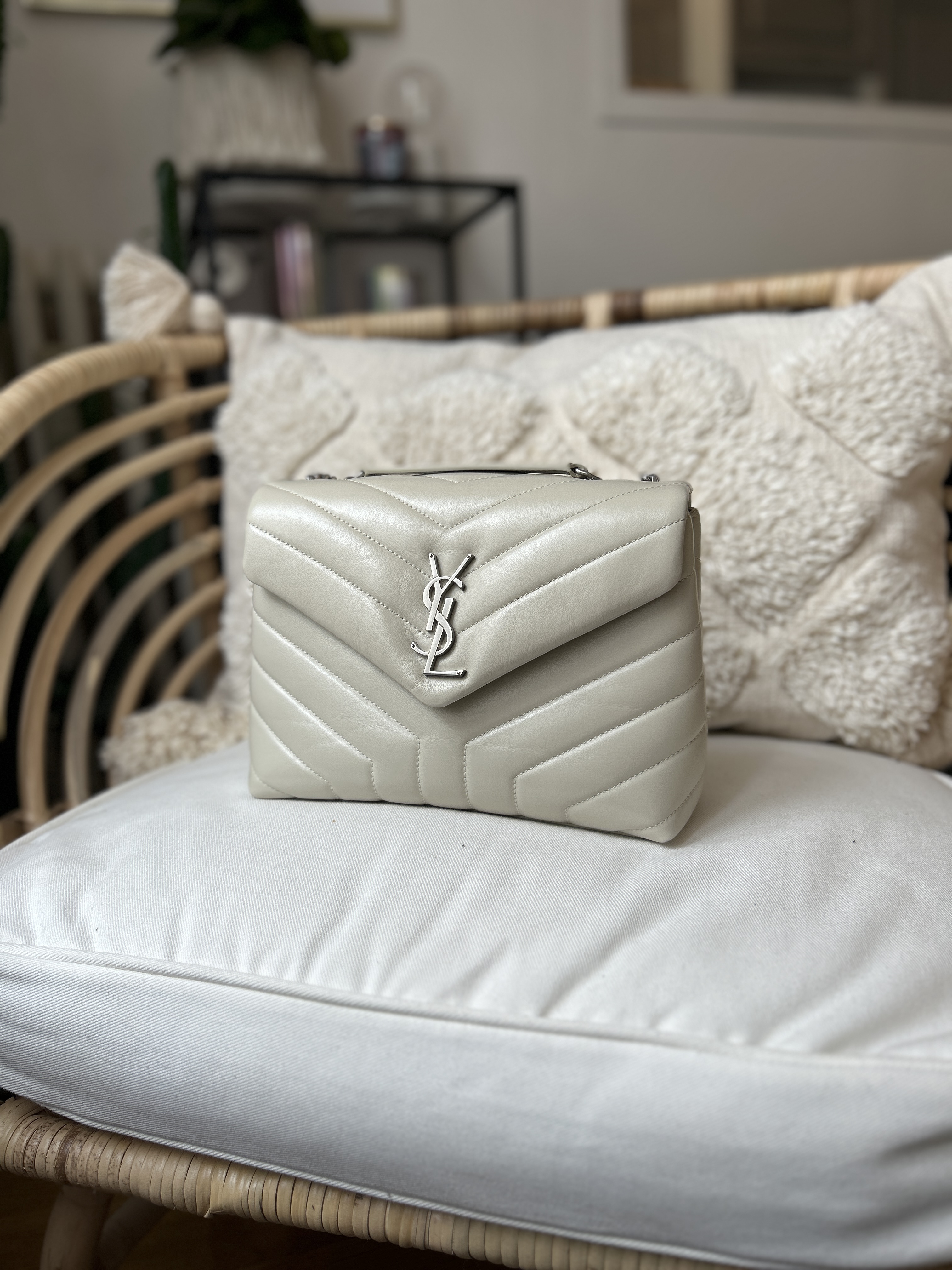 Vous avez sûrement vu sur Instagram que j’e me suis récemment acheté le Loulou Toy d’Yves Saint Laurent. Seulement, je n’ai jamais vraiment accroché avec ce sac que je trouvais vraiment petit au quotidien et un peu trop casual (la bandoulière est en cuir et non en chaîne comme sur les autres Loulou). J’avais donc pour plan d’acheter le modèle Small à sa place, une fois que j’aurais trouvé le même coloris – blanc vintage – à un prix compétitif. Je l’ai shopé via Vestiaire Collective (mais en dehors de l’app pour éviter les frais astronomiques) et je suis ravie d’avoir pris cette taille car il est plus spacieux à l’intérieur et plus élégant avec sa chaine en métal et cuir et ses différents portés (épaule, bandoulière, cartable).