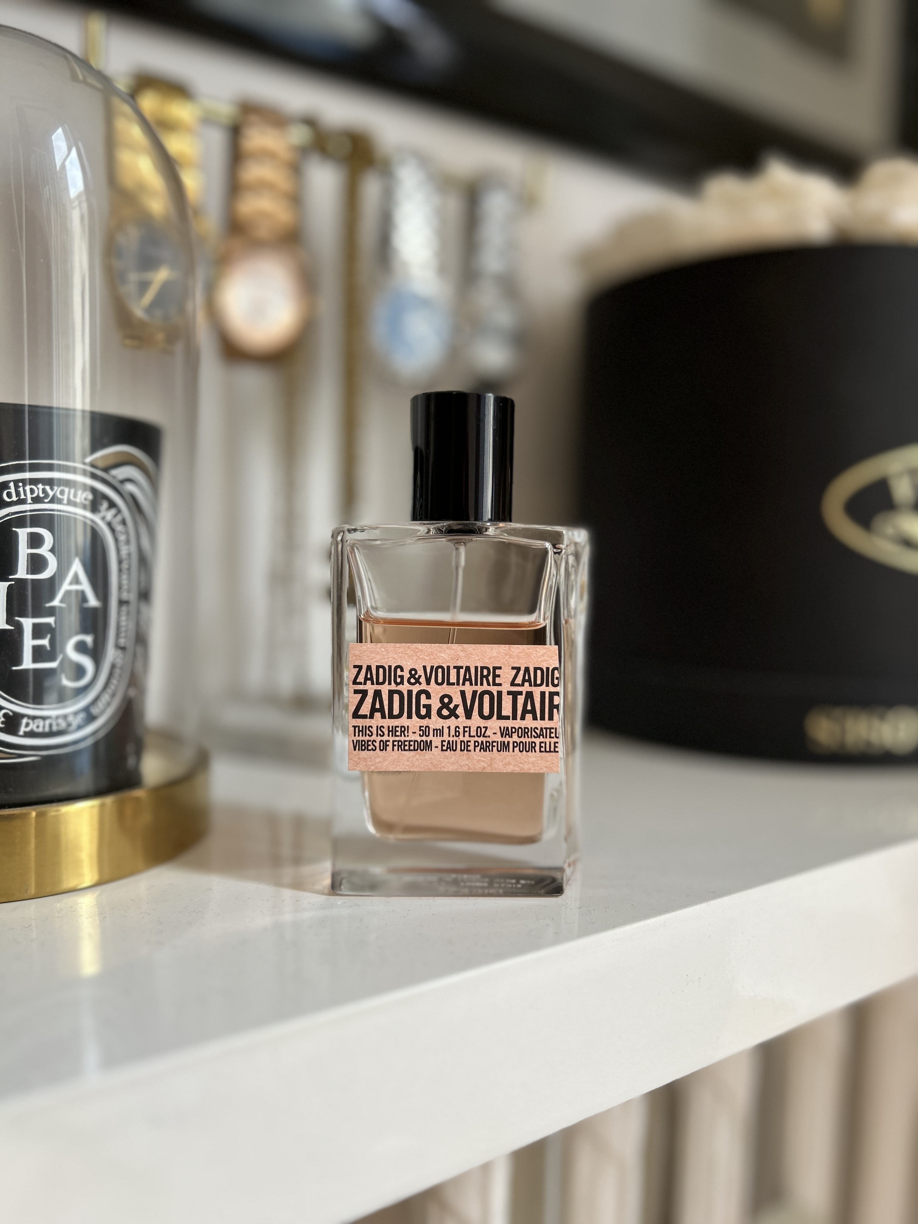 Ça fait des années que je porte This is her! de Zadig & Voltaire, qui a récemment sorti une déclinaison appelée This is her! Vibes of freedom que j’ai demandé pour mon anniversaire car j’aime beaucoup changer de parfum au gré des saisons. C’est une eau de toilette fraîche et florale, clairement idéale pour le printemps/été : en note de tête on retrouve un duo pivoine et poire, suivi de jasmin et de rose en notes de coeur et d’une note de fond à base de crème de marrons. C’est difficile de décrire une odeur par écrit, mais en tout cas j’aime beaucoup la porter cette année (même si j’ai l’impression que la tenue n’est pas incroyable, malheureusement).