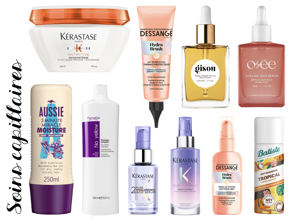 Une fois que mes cheveux sont lavés et hydratés, j’enlève l’excédent d’eau en les pressant au dessus de la baignoire puis avec une serviette de bain (on ne les entortille pas sur eux-mêmes, ça les abime !) et je glisse ensuite mes cheveux dans une serviette-turban Aquis. Après 30/45minde pré-séchage je passe aux soins et j’en utilise plusieurs sur cheveux légèrement humides. En premier, le Sérum 2% Acide Hyaluronique Pure de Kerastase qui est tellement génial que j’ai vu un effet immédiat sur mes cheveux dès la première application. Il les nourrit et répare terriblement bien, des racines aux pointes (en revanche ils recommandent d’en mettre une douzaine de pompes pour cheveux longs, autant vous dire que vous le videz en un mois à ce train là !). Ensuite, j’applique un sérum nourrissant, disciplinant et qui va aussi faire office de protecteur de chaleur. En ce moment c’est le lait de brushing thermo-protecteur Hydra Brush de Dessange, dont j’adore l’odeur et qui protège jusqu’à 230°. Puis je passe au styling (cf le paragraphe appareils) et j’applique le sérum de finition Anti-Frizz 48h de la même gamme pour discipliner les cheveux, prolonger le brushing et limiter les frisottis. Entre deux shampoings il m’arriver d’utiliser le soir le sérum Cicanuit Blond Absolu de Kerastase sur mes pointes pour les hydrater et les faire briller. Et si je décide de boucler/onduler mes cheveux, j’enduis les longueurs avec aléatoirement l’une de ces deux huiles capillaires le Sublime Hair sérum d’Osée Beauté ou la Honey Infused Hair Oil de Gisou, qui sentent divinement bon. Et si mes cheveux regraissent un peu trop vite entre 2 lavages, j’utilise évidemment du shampoing sec Batiste, avec une petite préférence pour le parfum Tropical.