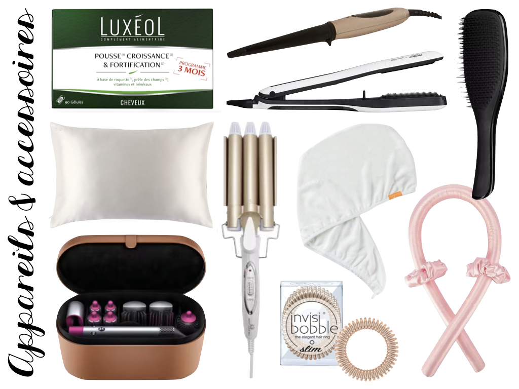 J’aime bien changer de « nature » de cheveux et je peux les avoir lisses le lundi, bouclés le jeudi et ondulés le dimanche. Pour cela, j’utilise différents appareils que je choisis avec soin car ce sont les appareils chauffants qui cause le plus de dommages aux cheveux. Pour ce qui est du séchage, j’ai demandé le Dyson Airwrap à Noël il y a 2 ou 3 ans et je ne regrette absolument pas cet achat tant il m’est devenu indispensable (peu importe la taille de la valise cabine, il sera dedans !). J’utilise en premier l’embout séchoir, puis je termine en lissant les longueurs à l’aide de l’embout brosse plat et enfin je donne du volume sur mes mèches de devant avec l’embout brosse ronde. Plus occasionnellement j’utilise les embouts bouclants mais ce très joli volume façon Dallas tient à peine 2h sur mes cheveux. Pour un lissage plus prononcé je me sers du Steampod 3.0 (qui a succédé à mon GHD mais que je lui préfère désormais) car il lisse très bien sans trop abimer les cheveux grâce à la vapeur d’eau qu’il diffuse. Si je veux des boucles (façon wavy et non pas anglaises), alors je me tourne vers mon boucleur Primark avec un embout conique, qui fait très bien son job pour seulement 11€. Et si je veux de vraies ondulations, alors j’ai un appareil wavy acheté sur Amazon qui marche aussi très bien.