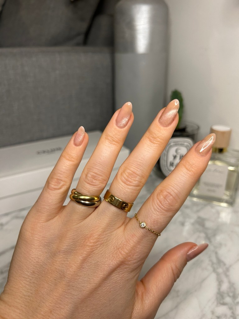 C’est la nouvelle tendance manucure qu’on voit partout sur les réseaux, succédant aux glazed donut nails popularisés par Hailey Bieber. J’ai donc moi aussi cédé à cette trend et j’ai demandé à ma PO un cat eye légèrement gold sur une base beige-rosée pour voir si j’aimais cet effet. Je trouve que ça réhausse très bien une manucure nude en lui donnant du relief et de la dimension (grâce à un aimant qui met en mouvement des pigments métalliques contenus dans le vernis). En revanche je ne sais pas si j’apprécierais sur une couleur plus foncée… à tester !