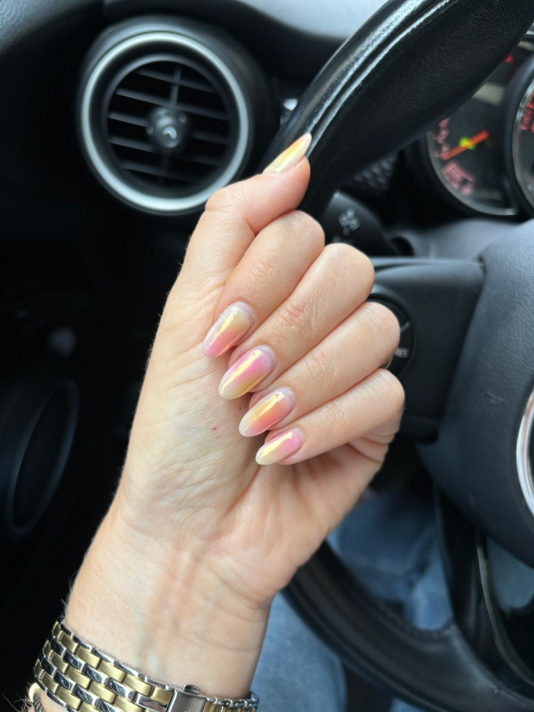 J’avais envie d’une dernière manucure aux couleurs vives pour clôturer la belle saison et surtout en profiter un maximum lors de mes vacances au soleil. Avec ma prothésiste ongulaire, on a mis du temps à trouver comment réaliser exactement ce nail art sunset, mais on a réussi avec un airbrush rose/orange sur une base nude rosée et en floutant le tout avec une poudre chrome jaune dorée en top coat. Le rendu est absolument superbe et encore plus sur peau bronzée !
