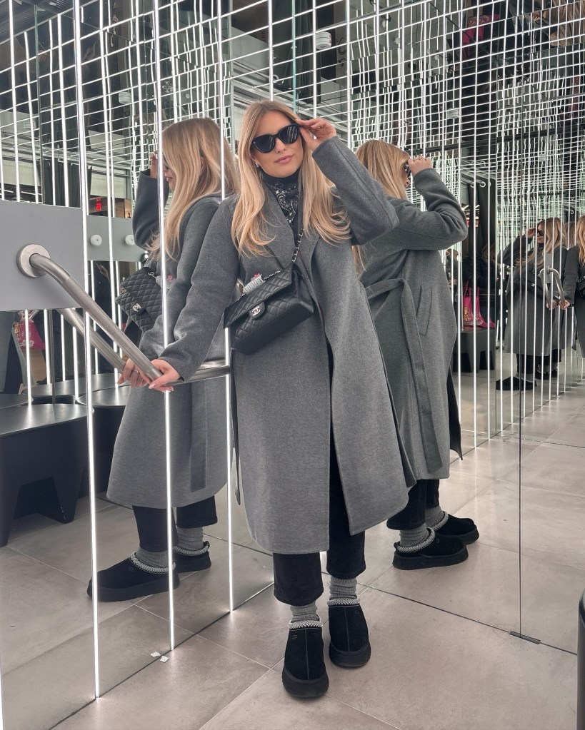 J’ai acheté peu de choses pendant les soldes mais ce que je cherchais absolument, c’était un manteau façon peignoir en laine mélangée gris, qui soit assez qualitatif pour le garder plusieurs années. Dans ces cas-là, Uniqlo, roi des bons basiques, des belles coupes et des belles matières, ne déçoit jamais. Alors il est composé d’un peu moins de laine que son pendant noir de chez Mango, mais les manches sont doublées pour y glisser plus facilement les bras et les poches sont cousues sur l’intérieur. Je viens en plus de voir qu’il est bradé à 70€ (et il existe en plusieurs coloris) donc profitez-en si vous vouliez un joli manteau (il y a souvent du réassort sur les tailles).